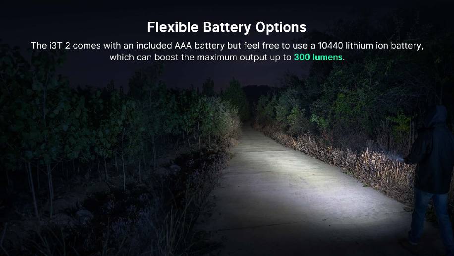 For those times when 200 lumens won't cut it, the i3T2 also supports a 10440 rechargeable lithium battery to boost the maximum output up to 300 lumens.