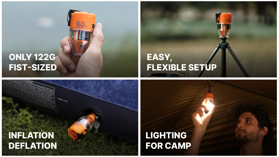 With six different nozzles, it supports a wide range of functions—from inflation and deflation to blowing air for combustion, dust removal, and even lighting. It can instantly transform into a 300-lumen, three-color atmosphere light. Whether you're facing -20°C snow or exploring 5000 meters above sea level, it's the perfect companion for any adventure. From outdoor trips and home cleaning to ceremonial lighting, everything is handled effortlessly—right in your pocket.